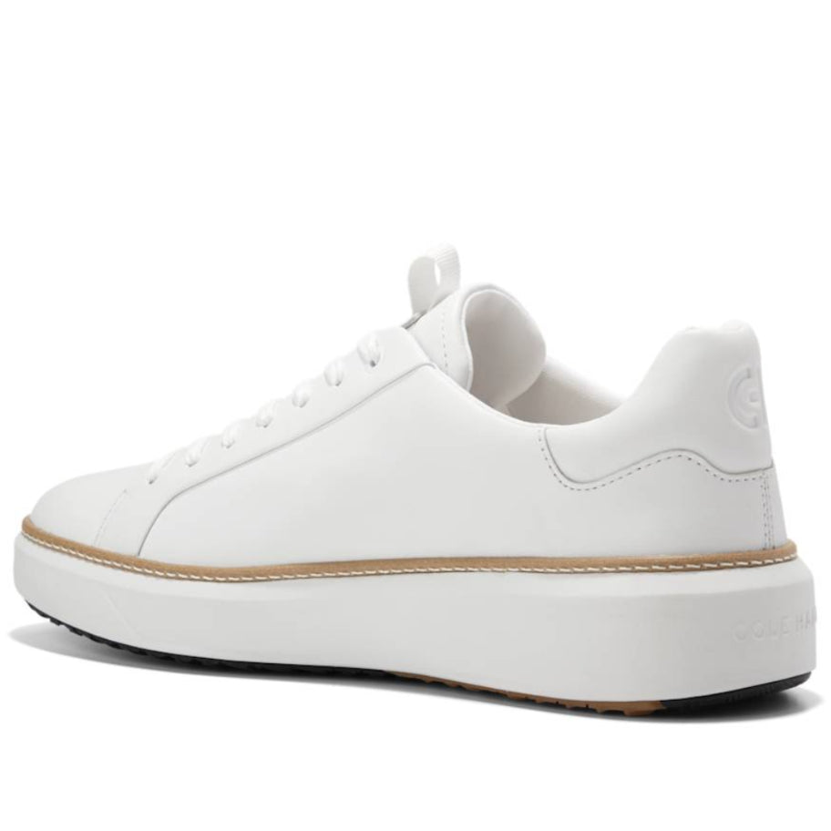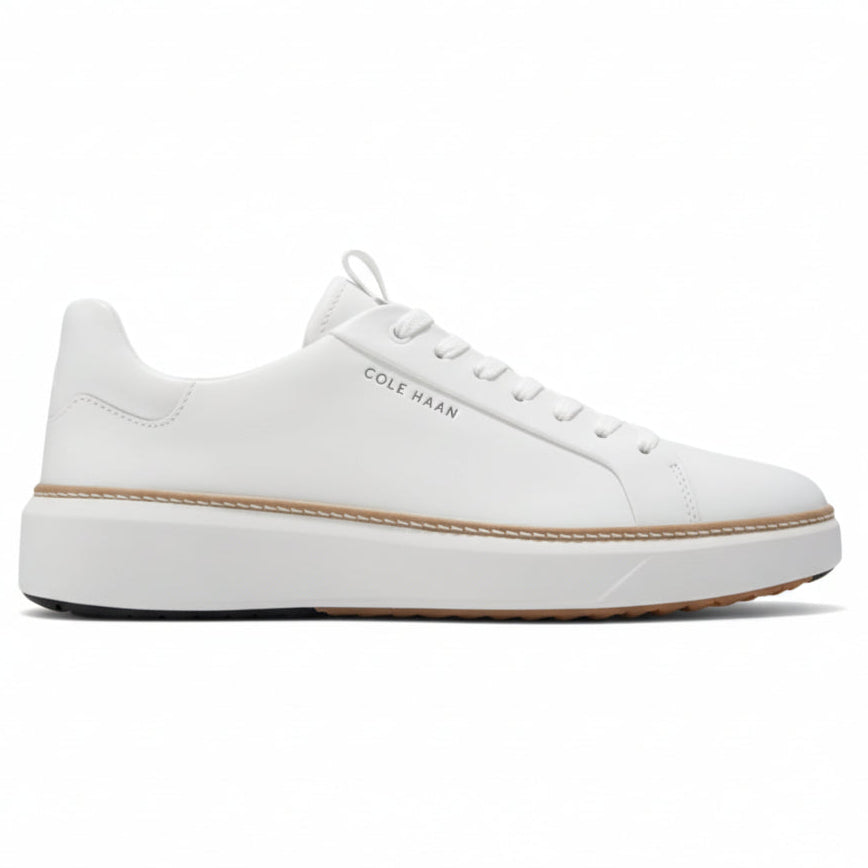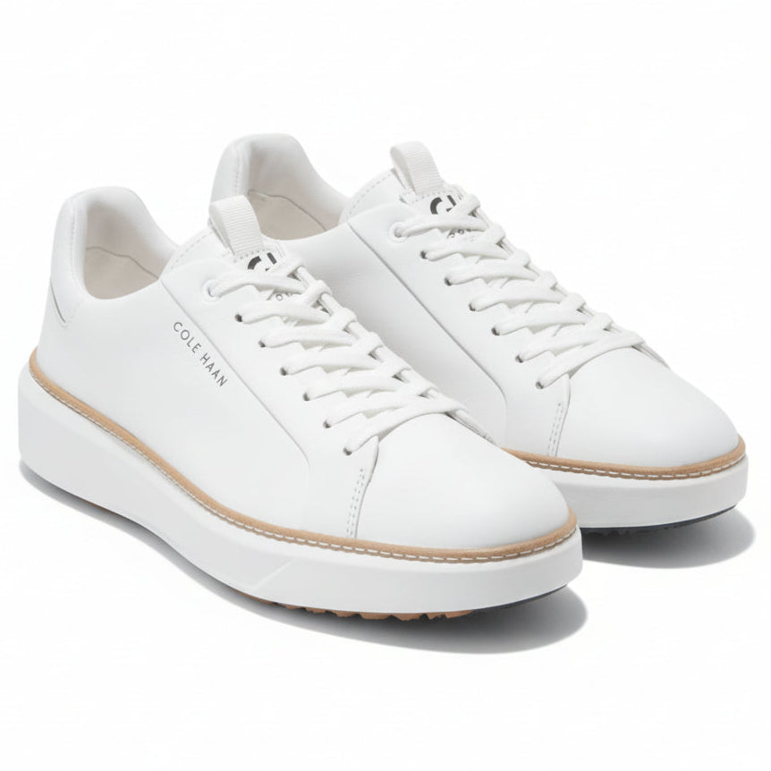 A golf shoe with follow-through: GrandPrø Topspin Golf in waterproof leather with sealed seams, a cushioned footbed with added padding at its heel and collar, plus a rubber outsole with traction without the use of old-fashioned spikes.