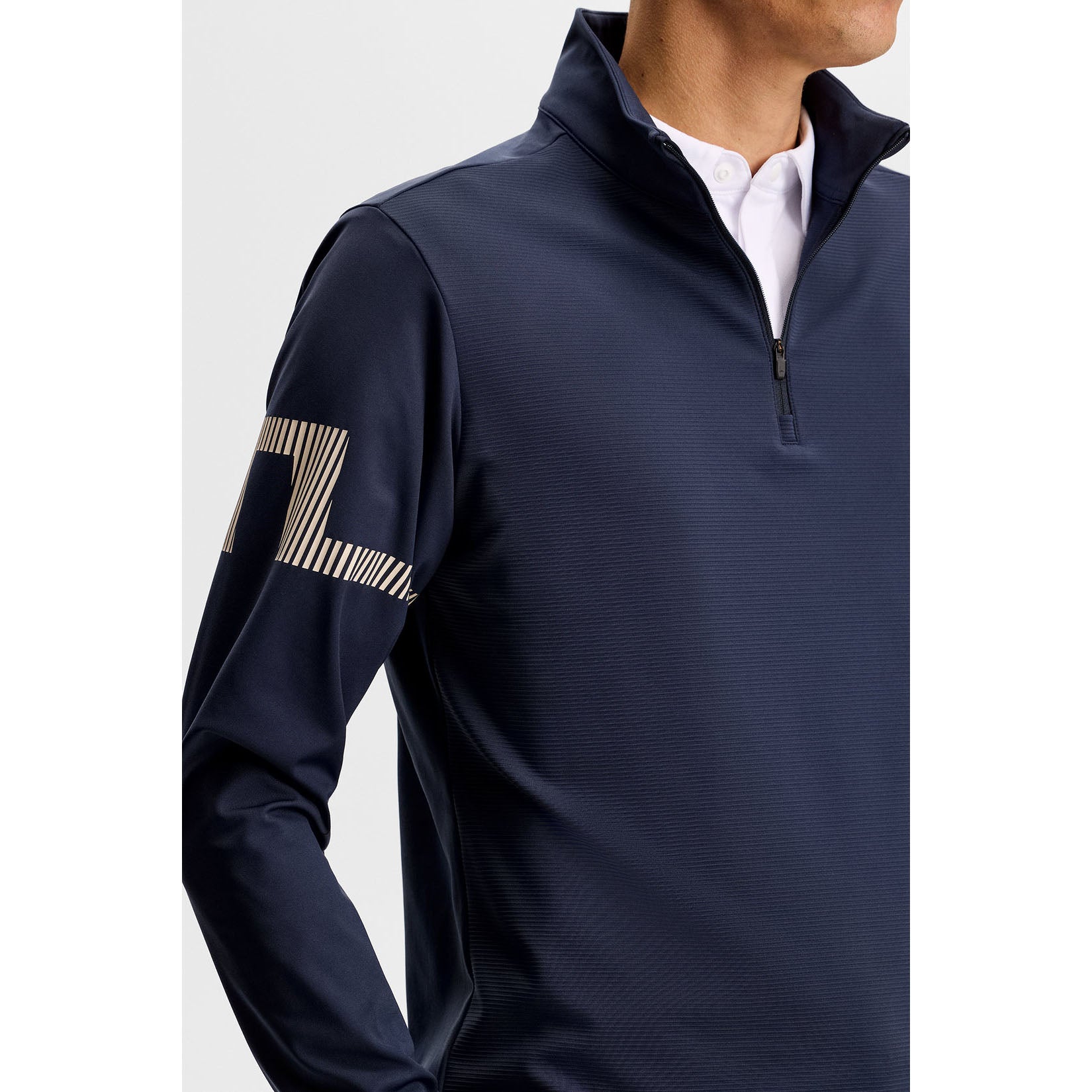 Signature Bridge Branding: Logo on the collar with Bridge artwork on the sleeve for a refined, performance-led accent.